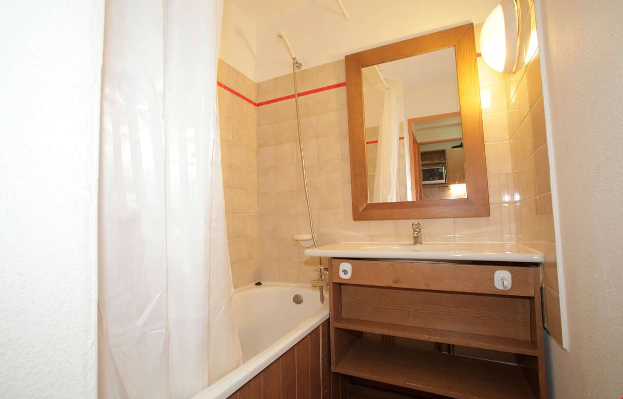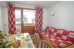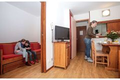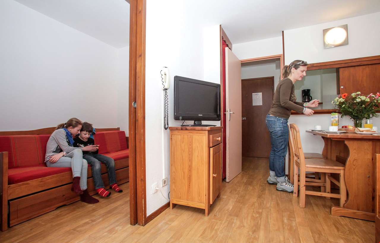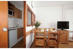 Studio 4 (21 m²) = vchod s palandou nebo rozkládacími lůžky, obývací pokoj s rozkládacím gaučem pro 2 osoby, vybavený kuchyňský kout , sprcha s WC, balkón