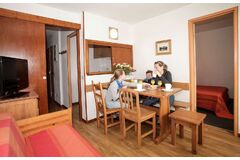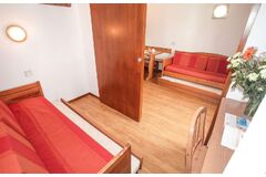 Apartmán 6 (cca 30 m²) = obývací pokoj s rozkládacím gaučem pro 2 osoby, výklenek s palandou, vybavený kuchyňský kout, ložnice s manželskou postelí nebo oddělenými lůžky, koupelna nebo sprchový kout a samostatné WC, balkón